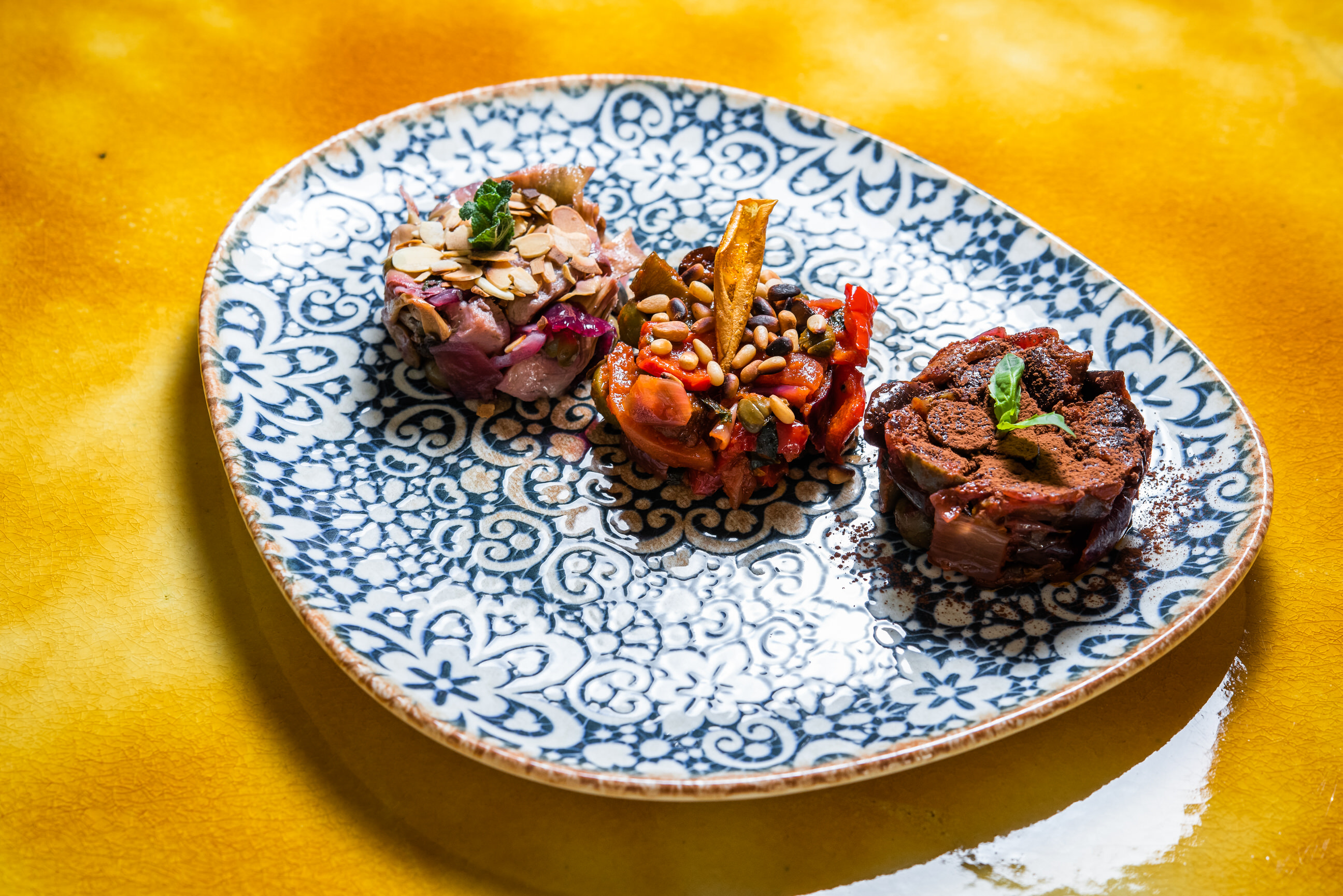 El cariño por una tierra como Sicilia queda patente en platos regionales como la tagliata de lomo bajo, o en elaboraciones a base de zizzona (mozzarella enorme de 5kg) o bottarga (huevas de atún en salazón) provenientes directamente de la isla.