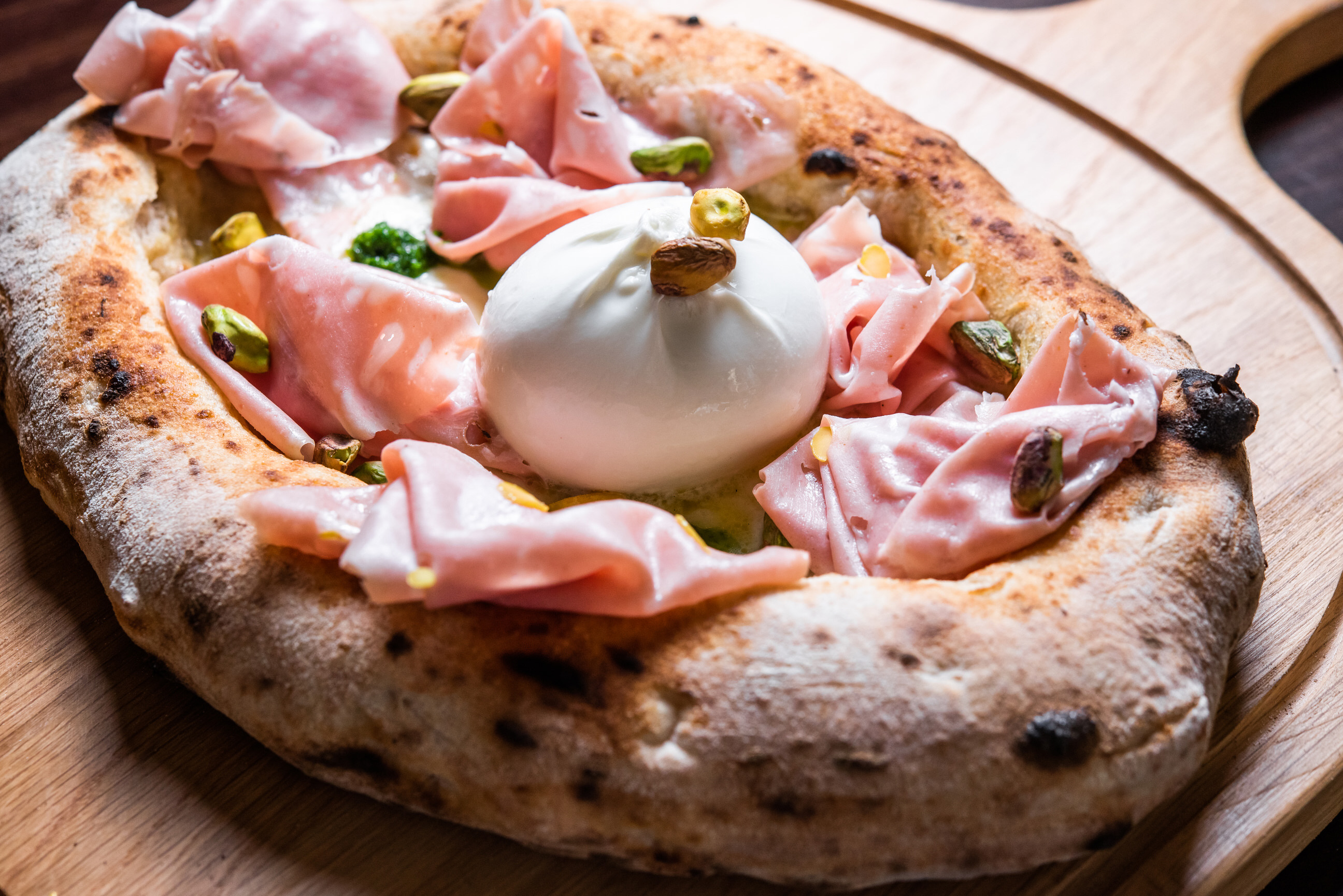 Esa mezcla de clásico y modernidad lo convierten en un lugar delicioso. Por eso, una cocina a la última no descuida el buen trato a una materia prima espectacular, no deja de tener tampoco los platos más famosos de la comida italiana, en la que no puede faltar un plato de pasta y una pizza. En este caso os invitamos a probar los busiati con pesto de Trapani y carabinero de Huelva por un lado. Y por otro lado tenemos la pizza covazzino Bronte con burrata, mortadella “Favola” y pesto de pistacho de Bronte.