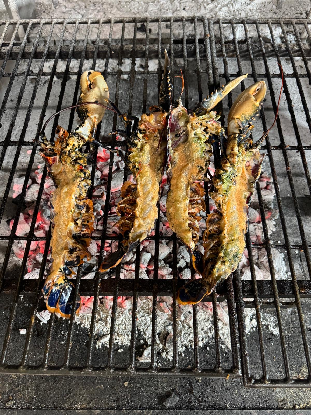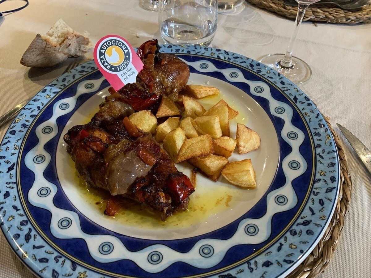 Carnes: capón de Villalba asado. El sol se hunde en el horizonte, marcando un día de sabores puros y brisa salina.