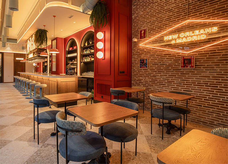 Si no lo conoces todavía. La historia de Gulah huele a novedad. Abrió sus puertas a mediados de 2025 de la mano de Jesús González Espartero, al frente del Grupo Alma of Spain. Es un restaurante informal, pero con una estética cuidada al milímetro. Gracias a la mano de Néstor Marcos Architecture tiene un diseño clásico que traslada al barrio francés de Nueva Orleans con detalles de vegetación como los de los edificios coloniales y toques industriales. Una enorme barra capta las miradas nada más entrar, y también hay mesas altas y bajas, zonas de paredes de ladrillo visto, televisión para disfrutar de eventos deportivos, y unas amplias cristaleras que dan luminosidad al local y permiten ver la siempre animada terraza.