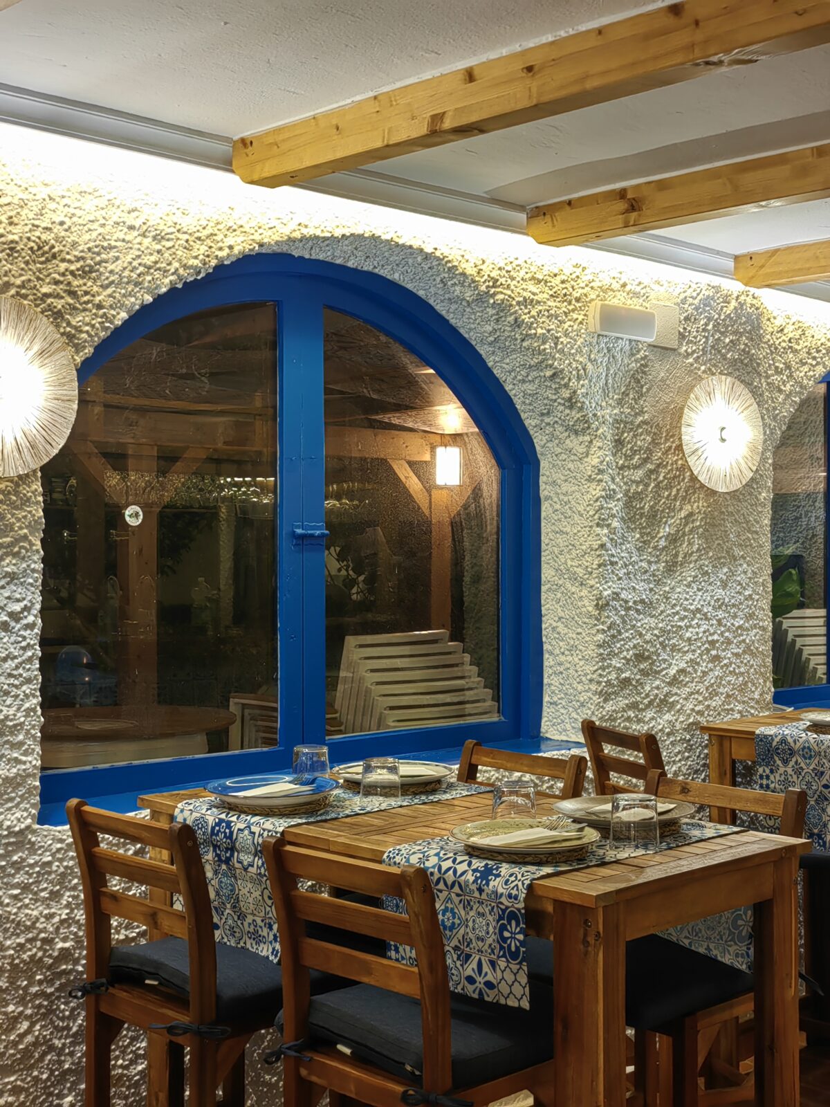 El espacio, concebido con una estética cálida y mediterránea, busca mantener viva la relación entre lo local y lo contemporáneo. Maderas claras, cerámicas de tonos marinos, luz natural y ese equilibrio que solo da la distancia justa entre el fuego y el mar.
