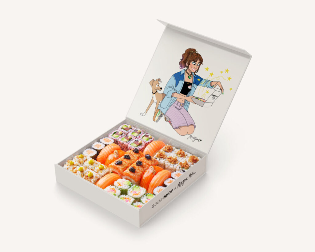Su caja de 42 piezas, que da vida a personajes en unmomento Sushi Shop. En su interior, tres nuevas recetas, cada una con una personalidad única: El Goloso, intenso y generoso, El Creativo, atrevido y floral, El Relajado, suave y equilibrado. Alrededor de este trío inédito, descubre una selección de imprescindibles, para una sushi box a la vez que es a la vez expresiva, deliciosa y fiel a la esencia de Sushi Shop. Una colección para difrutar según antojos… o formas de entender la vida.