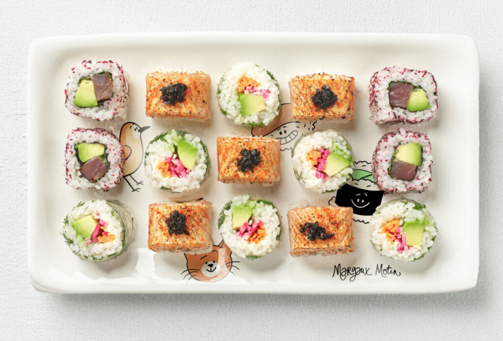 En sus locales de Madrid y Barcelona, quedan muy claros estos planteamientos. Quizás la prueba más evidente es su continua renovación de la carta y la propuesta de creadores y cocineros que ofrecen un sentido muy personal a cada temporada. Por ejemplo, en estos días, seofrecen las creaciones de la ilustradora Margaux Botin, que integra sus dibujos e diseños con nuevas opciones de sushi… ¿El resultado? Pues una apuesta por una creatividad que se transforma en un golpe de sabor.
