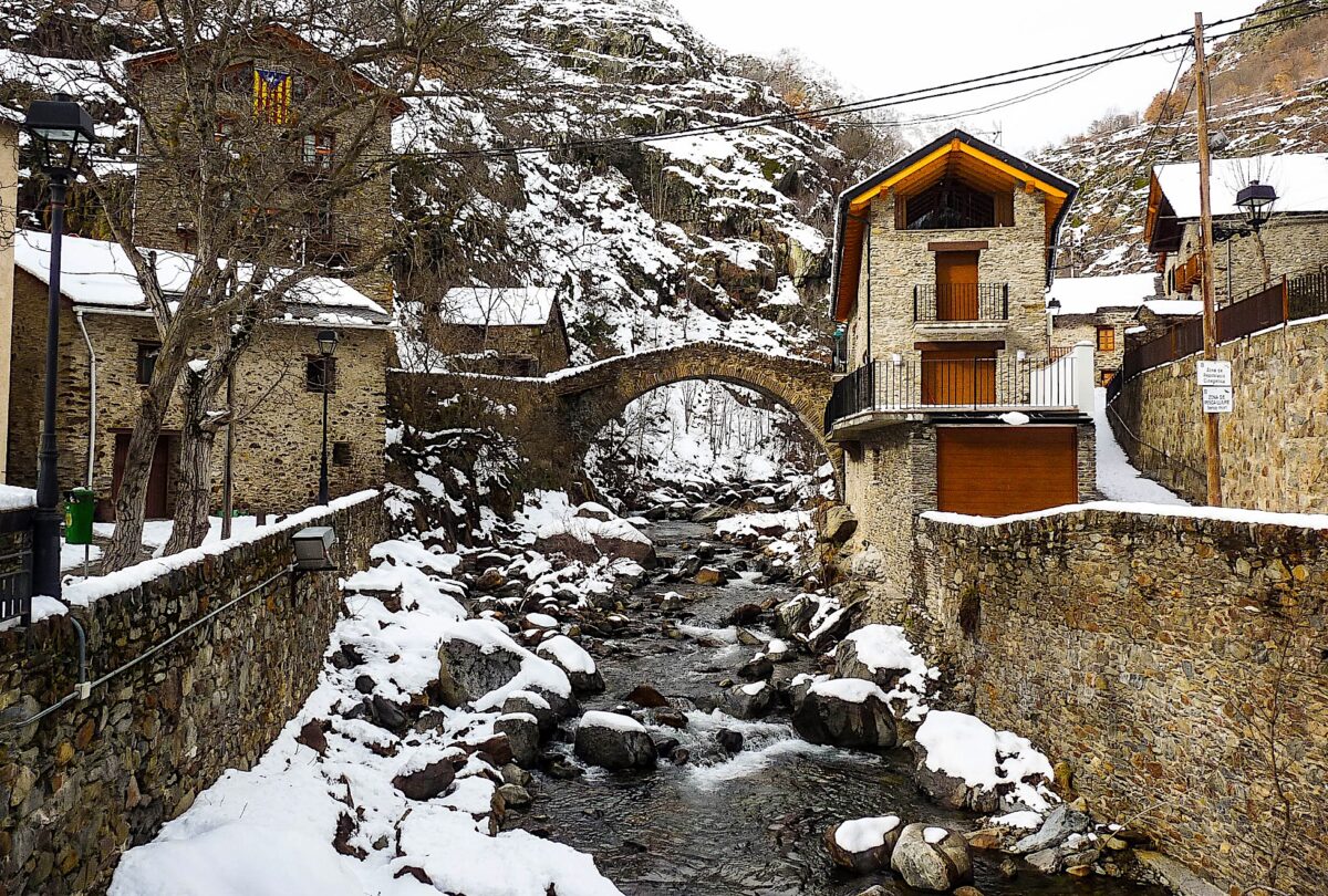 Alós d’Isil es un pequeño pueblo de postal escondido en el valle de Àneu, en pleno corazón del Pirineo, junto al río Noguera Pallaresa y muy cerca del Parque Nacional de Aigüestortes i Estany de Sant Maurici. Es uno de esos núcleos a escala humana: pocas casas de piedra y tejado oscuro, un puente, la nieve pegada a las fachadas y el sonido constante del agua corriendo. En invierno, el conjunto resulta sencillamente irresistible.