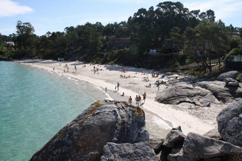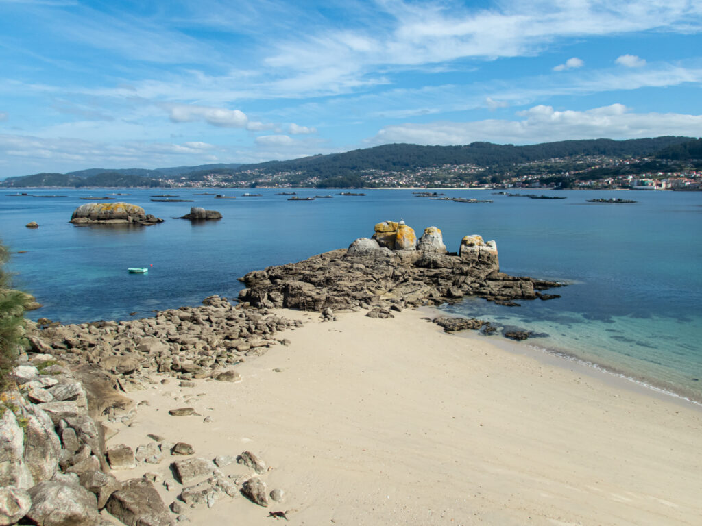 Pregunto qué es lo que se puede ver en estas aldeas de Aldán, y me mandan de inmediato al Pazo de Vistalegre, antigua propiedad de los condes de Aldao que dominaron estas tierras desde la Edad Media, unos Jardines Históricos con magníficos ejemplares de árboles centenarios, un acueducto elevado y un puente medieval sobre el río Orxas. En conjunto, Aldán me parece un lugar encantador, pequeño, recoleto, tan protegido por el Cabo Udra por un lado y Punta Couso por el otro… Se suceden las playas y y las calas como las de Pipín y Castiñeiras, pequeñas y solitarias, algunas con aguas añiles como la de Sartaxéns; otras tranquilas y rodeadas de bosques como Francón; algunas acogedora e íntima como la de Areacova. Unas de arena fina y otras, más pedregosas; unas largas y otras cortas, pero todas con la calma que da la ría y la vista en el horizonte de la otra orilla. Aquí, el fondo del mar es un tesoro para los buceadores: centollos, congrios, rodaballos, algas, esponjas, anémonas y un largo etc. de animales y plantas marinas.
