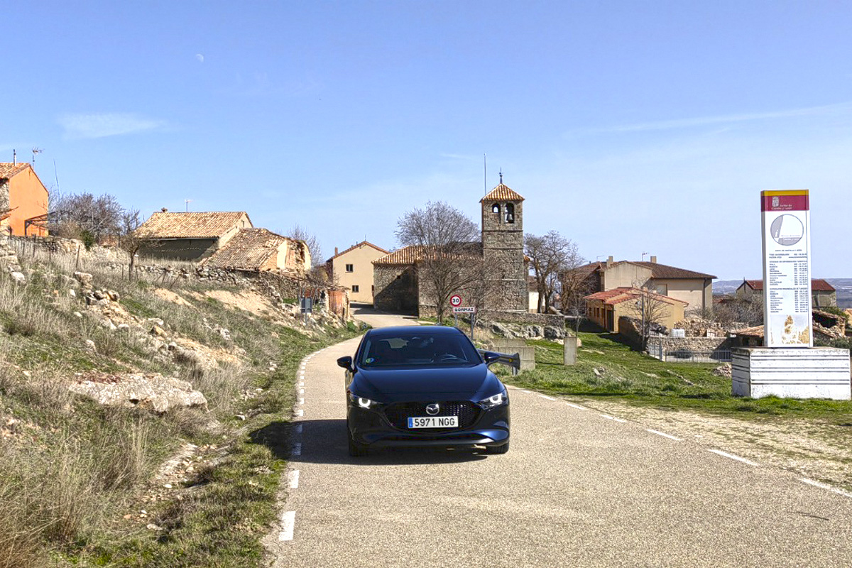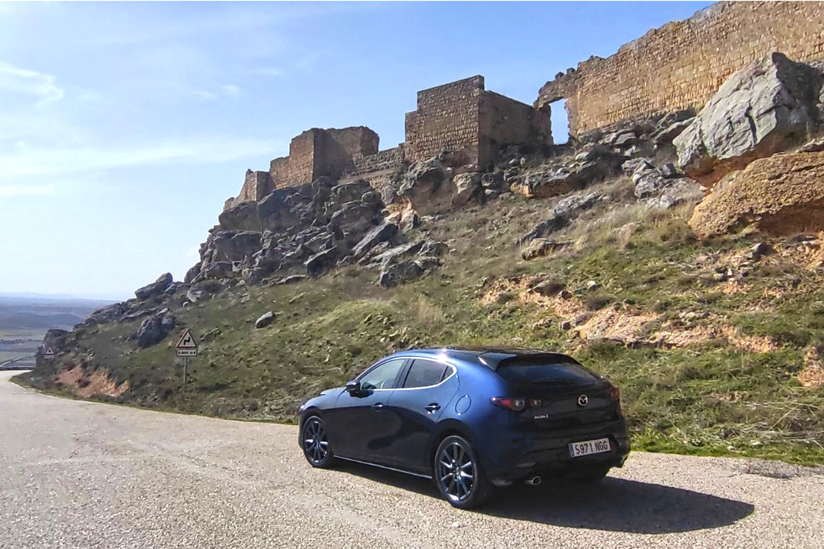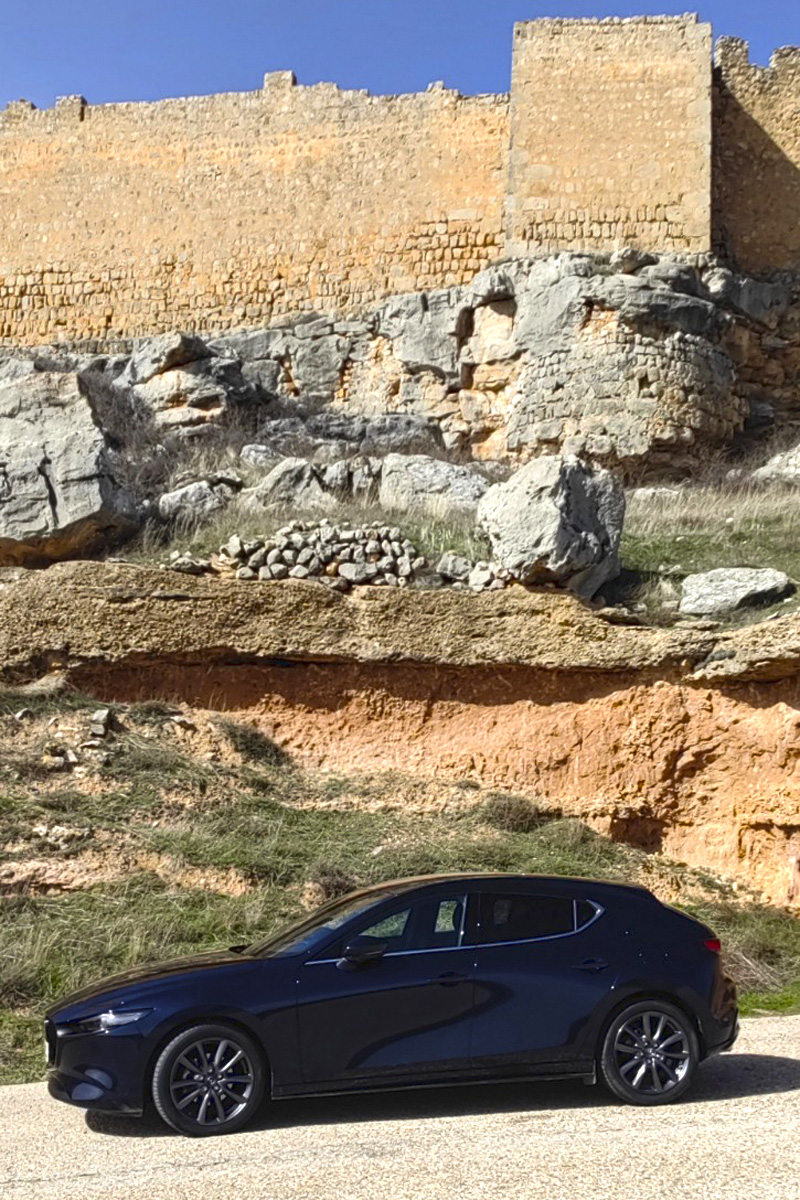 Algo parecido sucede en Caracena. Aquí el castillo parece pensado para quien disfruta entendiendo “cómo” se defendía una plaza. Caracena no se visita con prisa porque el entorno obliga a detenerse. Hay algo áspero y hermoso en estas hoces y cortados, en esa manera soriana de colocar los pueblos donde parecen imposibles. El Mazda 3 se mueve aquí con un aplomo que no pide aplausos: dirección que permite apuntar, suspensión que filtra sin aislar, y cambio manual para enlazar curvas con naturalidad. La conducción, otra vez, es ritmo, no exhibición.