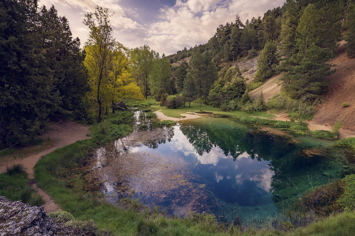 La Fuentona de Muriel es uno de los enclaves más enigmáticos de la geografía soriana. El agua brota aquí desde las profundidades del sistema kárstico formando una laguna de tonalidades turquesa que sorprende en medio del paisaje seco que la rodea. Durante años se creyó que no tenía fondo; hoy se sabe que su origen se pierde en galerías subterráneas aún parcialmente inexploradas.