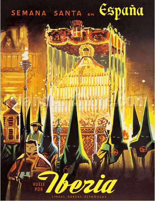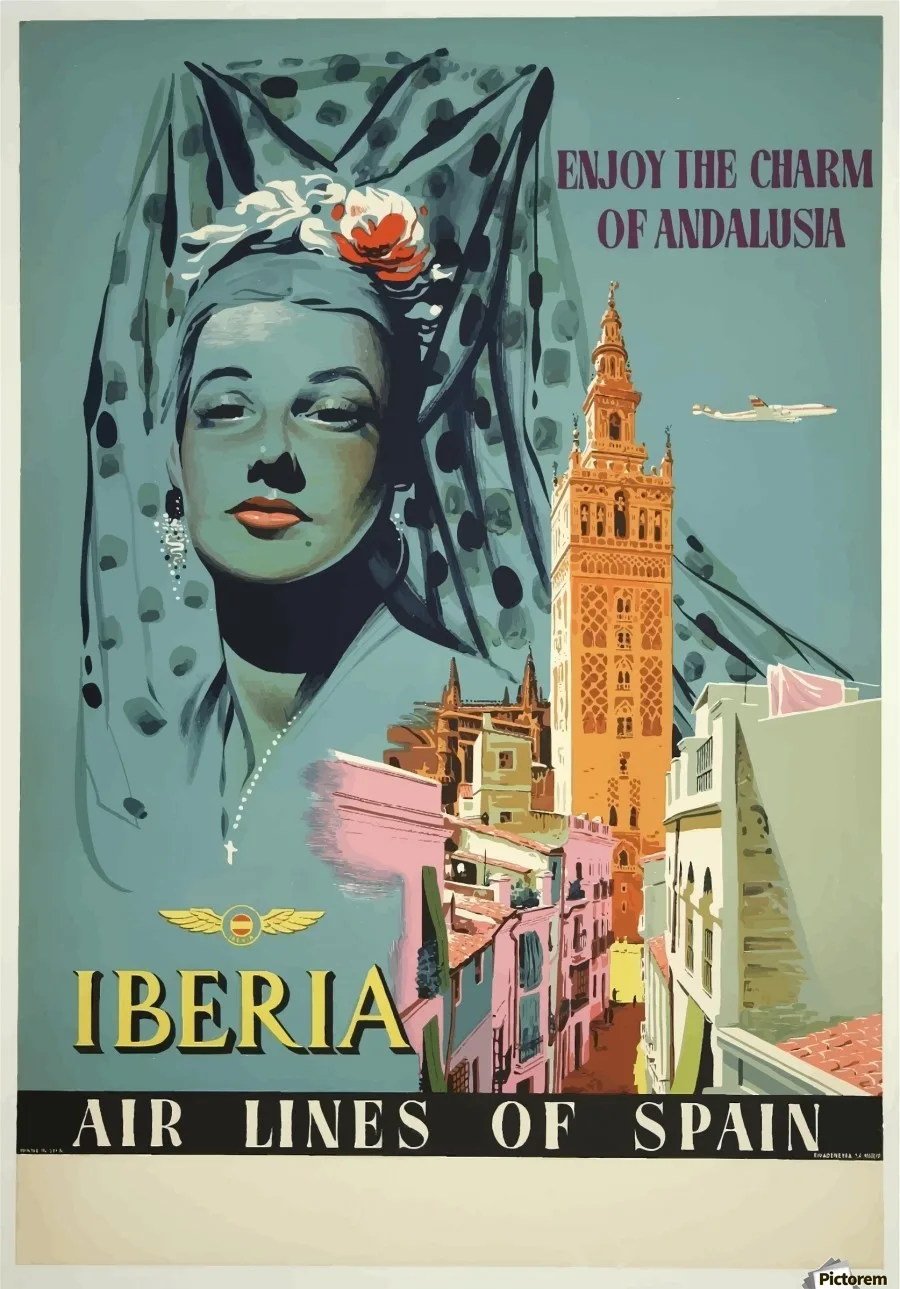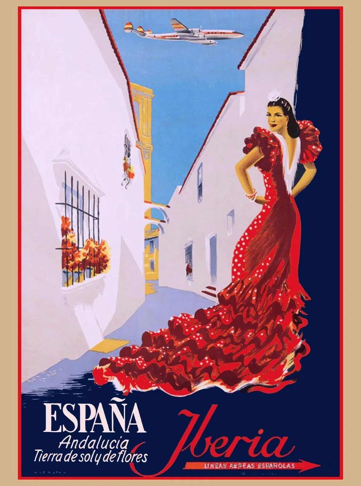 Esos carteles utilizados por Iberia, Lineas Aéreas de España, que servían para promocionar sus servicios durante la época dorada de la aviación no tienen nada que envidiar a los de las aerolíneas americanas o europeas del mismo período. Posiblemente, más racial y menos glamurosa, pero así era la vida en este país que puso de moda el Spain is Diferent.