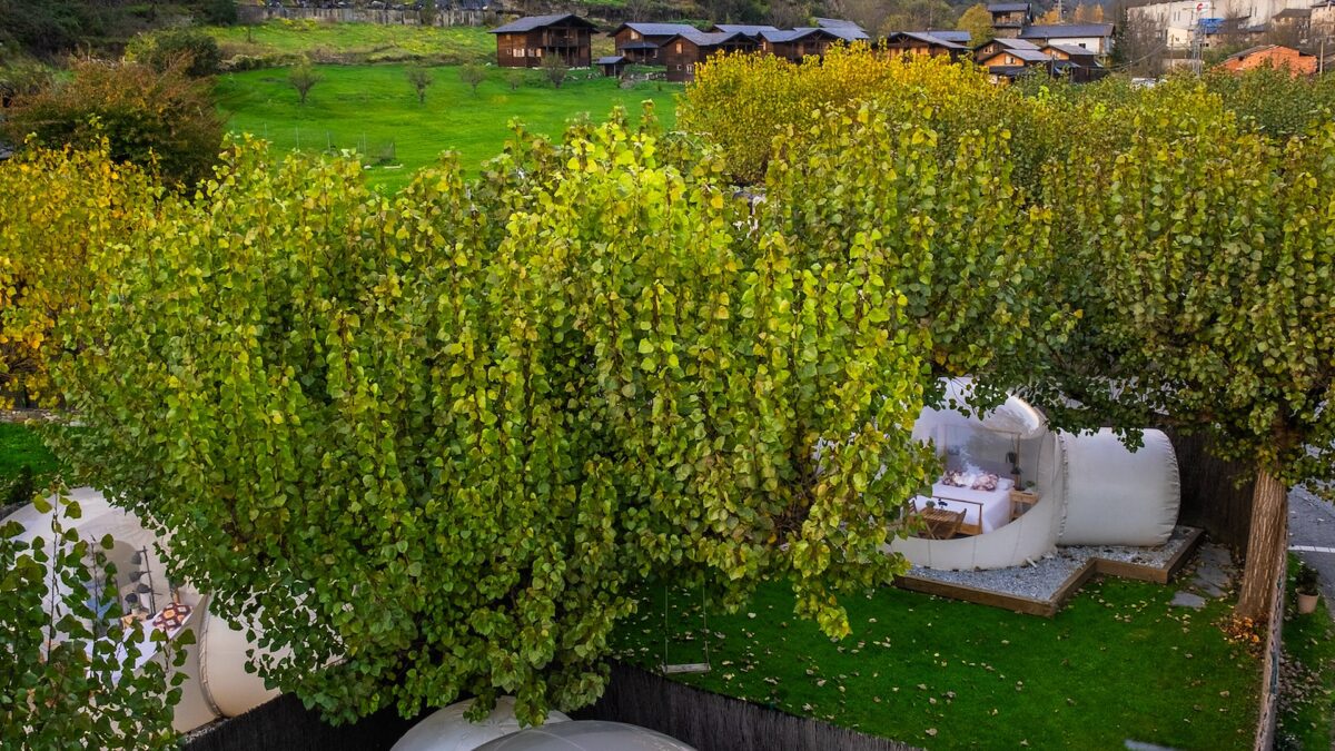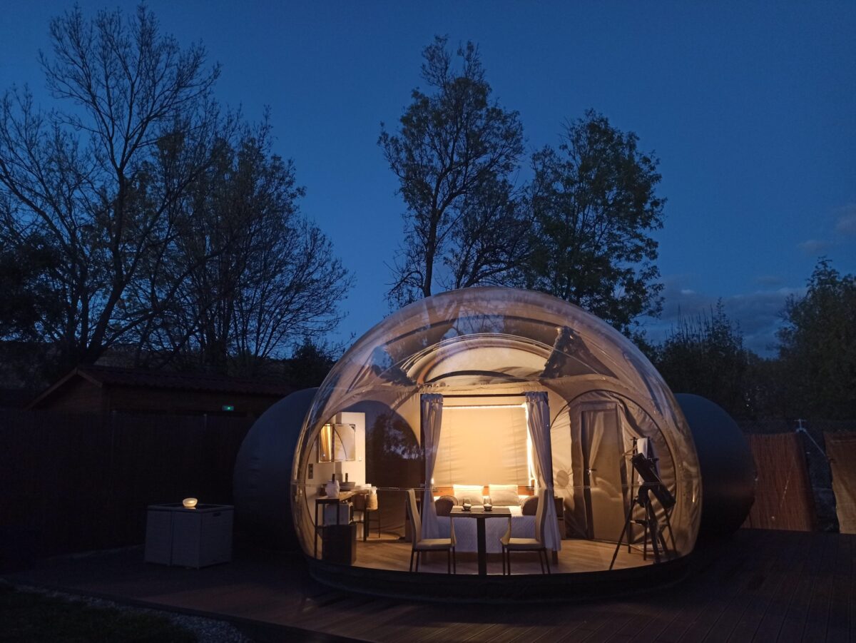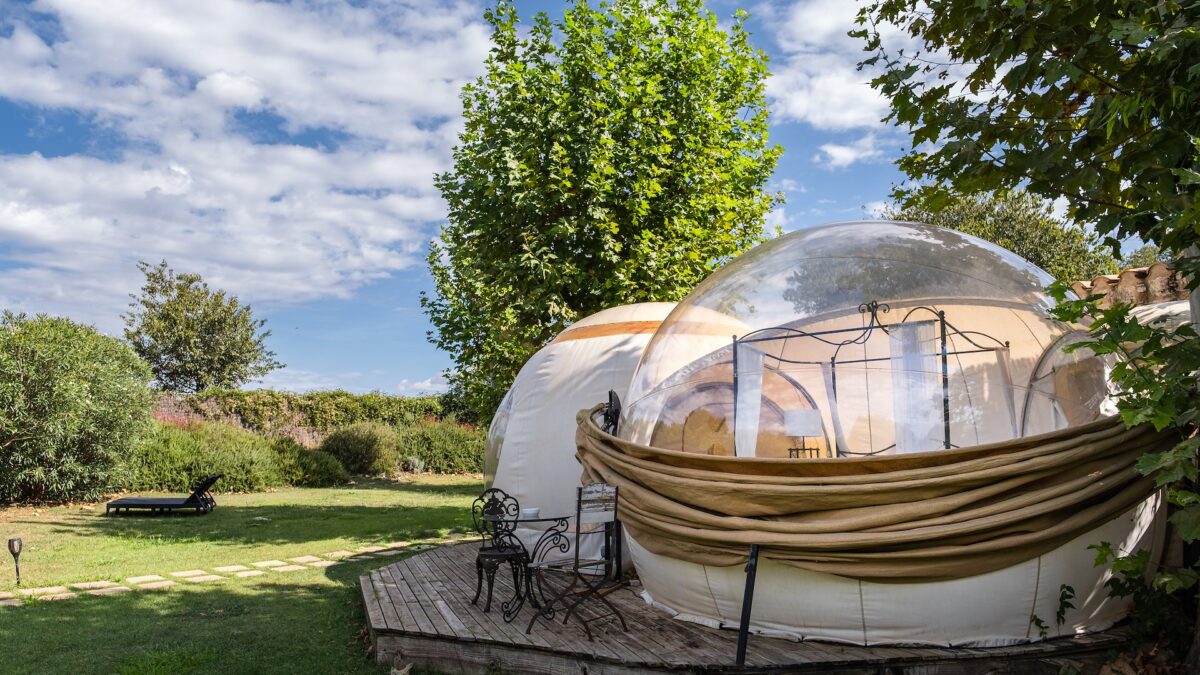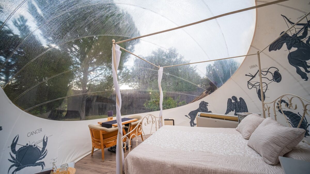En Cornellà del Terri, a pocos kilómetros de Banyoles y su lago, Mil Estrelles ocupa una antigua masía rodeada de campos, árboles y pequeños caminos rurales donde el silencio se impone, aunque la ciudad de Girona no quede tan lejos. Allí, entre muros de piedra y prados suaves, se despliega un pequeño universo de burbujas y suites astronómicas pensadas para mirar el cielo de la Cataluña interior sin renunciar a la comodidad. Algunas burbujas se esconden entre los árboles; otras se abren a prados más despejados donde la sensación de intemperie controlada es total.