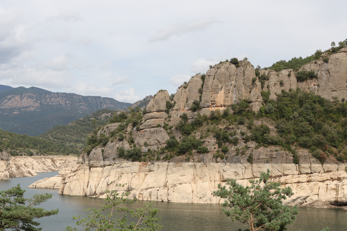 Retomando la carretera destino el pueblo de Solsona, la estación final de nuestra ruta, bordeamos el Embalse de la Llosa del Cavall o de la Losa del Caballo. Cada curva nos aleja un poco del bosque para acercarnos a las zonas de cereal y girasol. Este es un lugar alejado del mundanal ruido, y los enamorados del ocio acuático lo saben. Los kayaks y sus tripulantes son parte de la estampa habitual. Aquí encontramos toda la cabecera del río Cardener, afluente del Llobregat. 122 metros de altura, 200 hm2 de superficie y un horizonte agreste esculpido a base del paso del tiempo y sus caprichos.